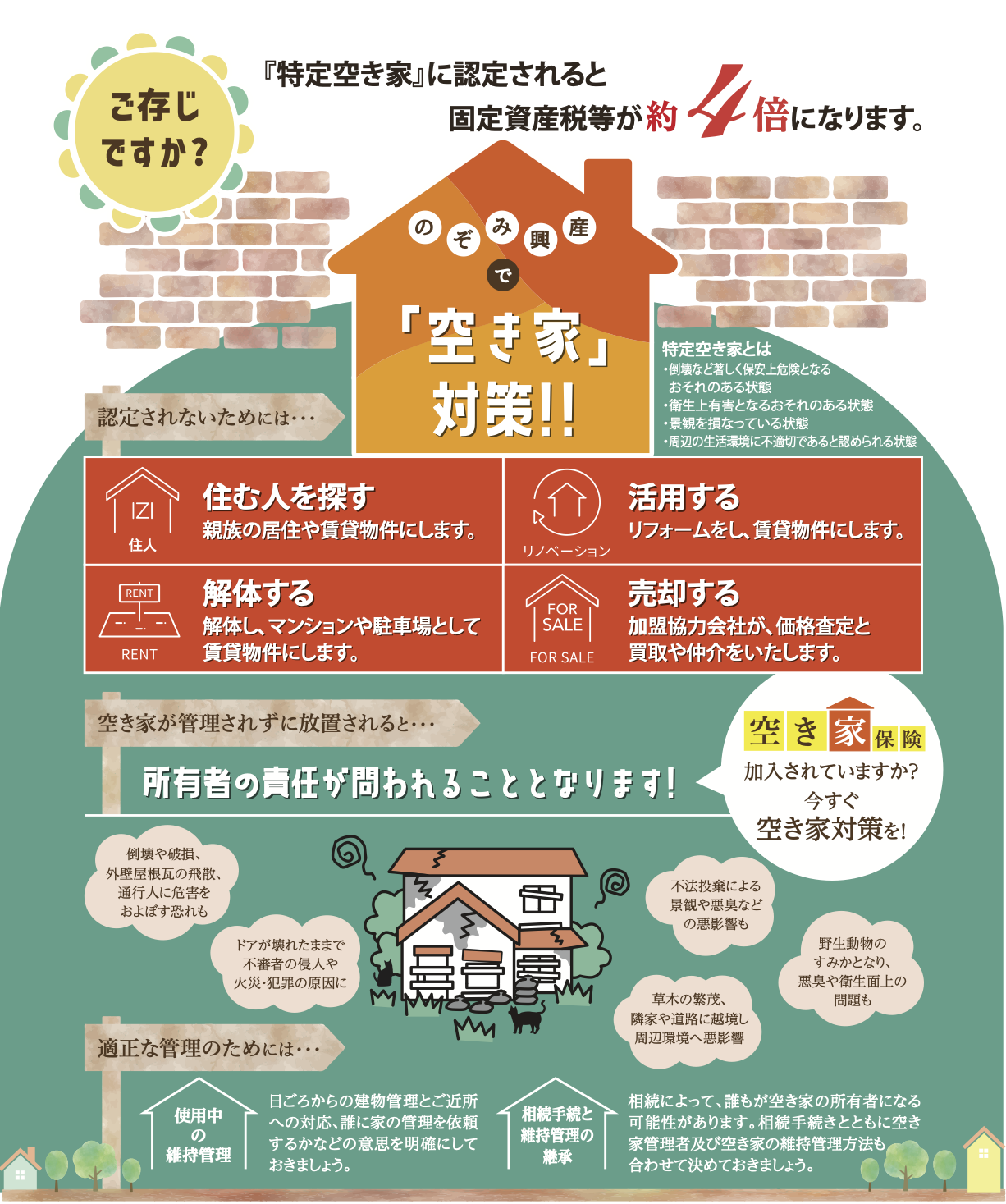 のぞみ興産株式会社 高価買取・高価売却 相続不動産 空き家管理 会社概要 お問い合わせ SERVICE 空き家管理 CONTACT 0120-313-012 all day 9:00-17:00 COTACT